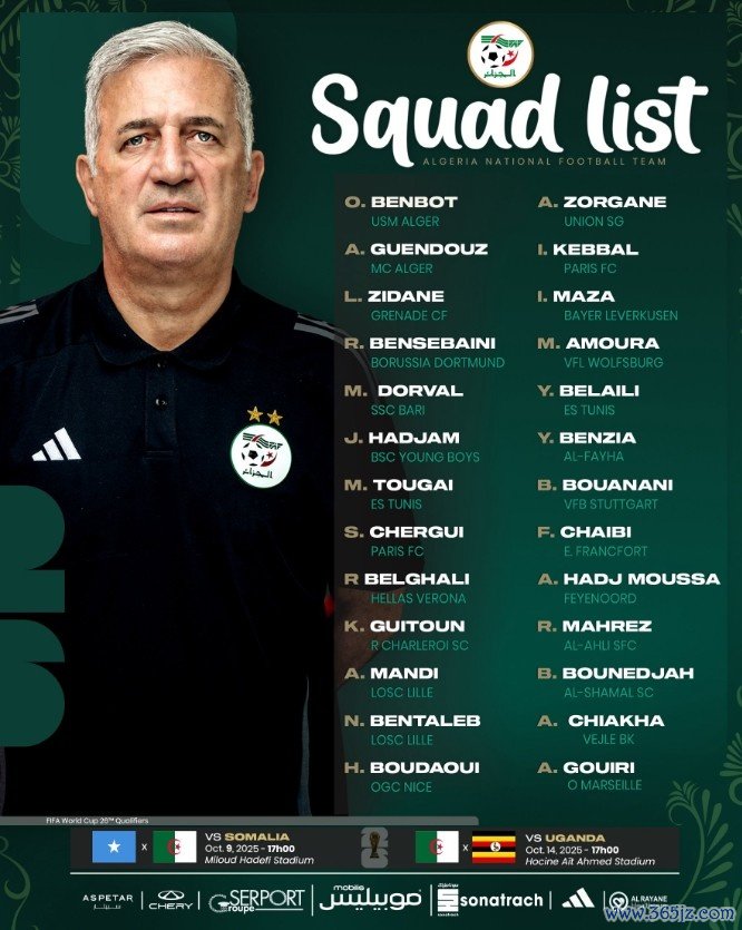 10月2日讯 为了迎接行将到来的对阵索马里和乌干达的比赛,阿尔及利亚公布了新一期的国度队大名单,马赫雷斯、本塞拜尼领衔,皆达内之子卢卡入选。