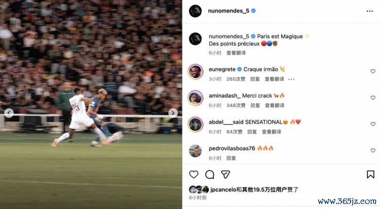 10月2日讯 欧冠联赛阶段第2轮巴黎2-1打败巴萨,赛后巴黎后卫努诺-门德斯发文庆祝得胜。