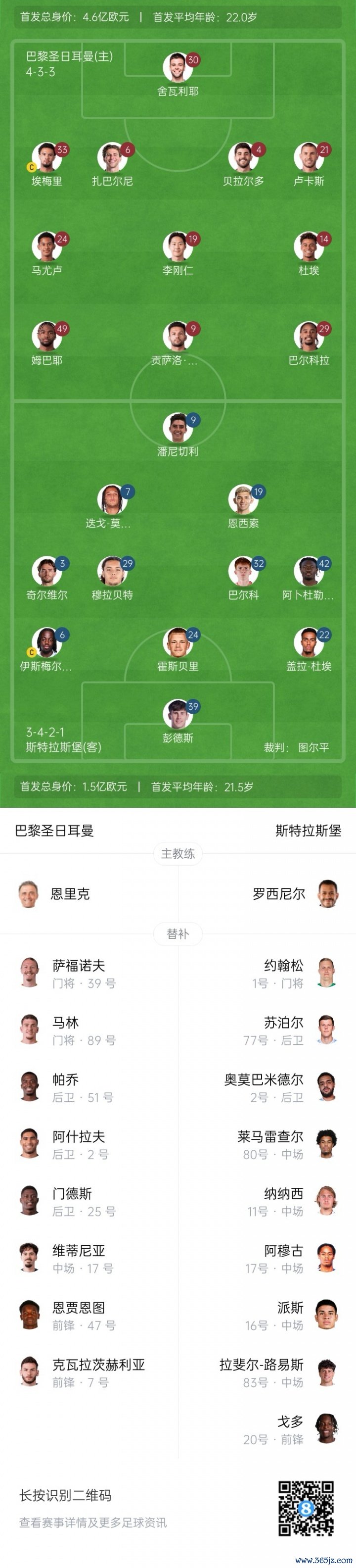 巴黎圣日耳曼替补:39-萨福诺夫、89-马林、2-阿什拉夫、25-努诺·门德斯、51-帕乔、17-维蒂尼亚、7-克瓦拉茨赫利亚、47-恩贾恩图