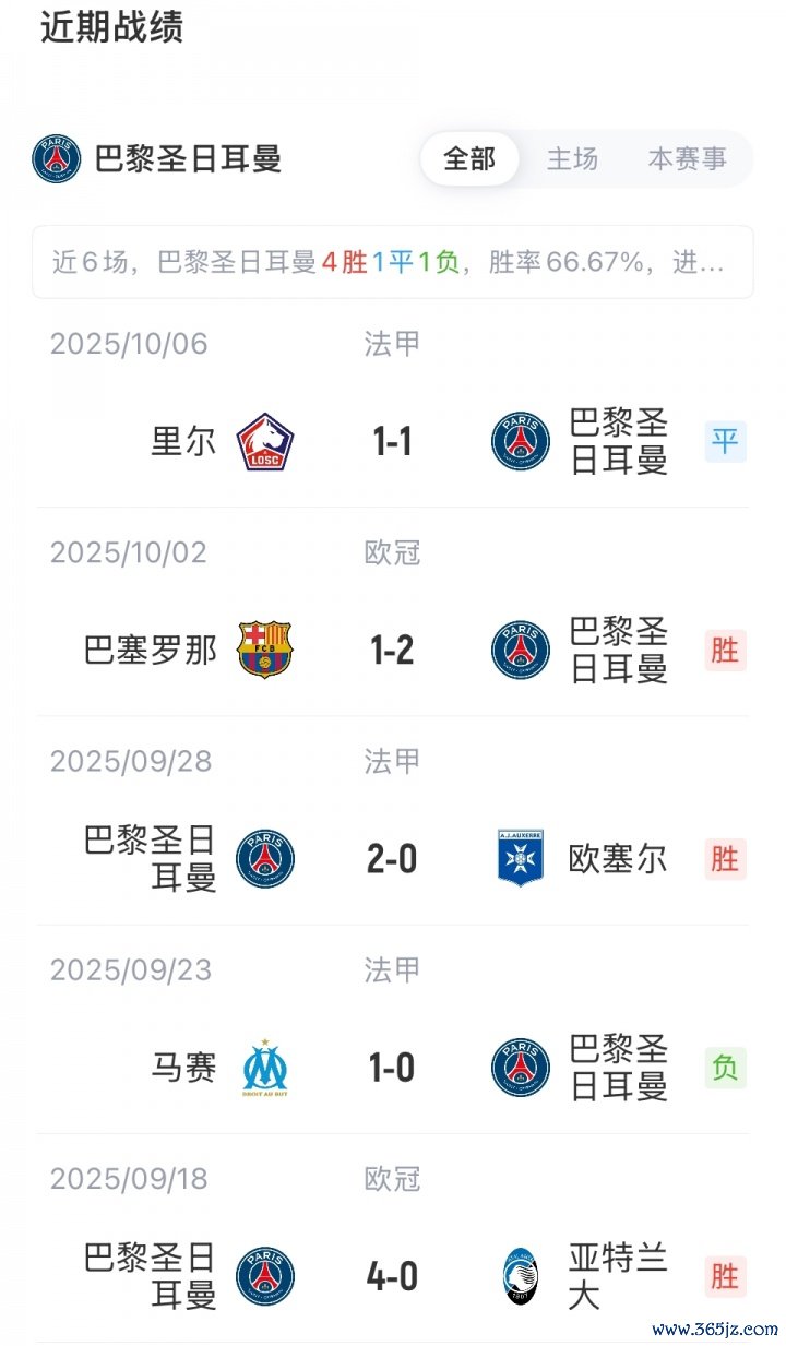 巴黎圣日耳曼首发:30-舍瓦利耶、4-贝拉尔多、6-扎巴尔尼、21-卢卡斯·埃尔南德斯、24-马尤卢、33-扎伊尔·埃梅里、9-贡萨洛·拉莫斯、14-杜埃、19-李刚仁、29-巴尔科拉、49-姆巴耶