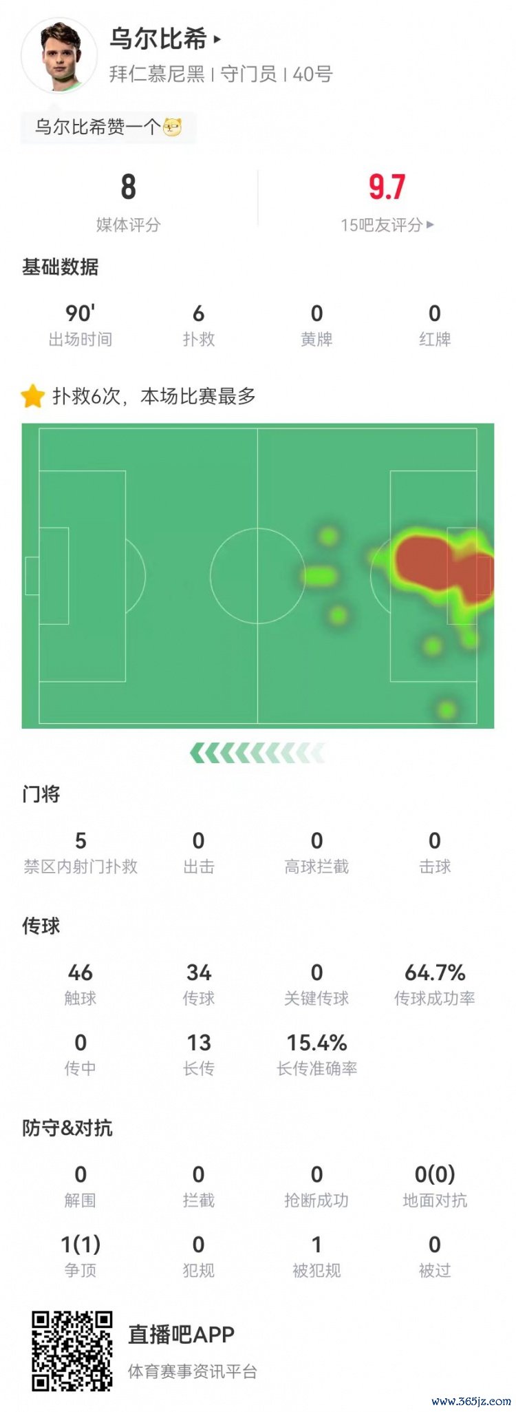 6扑救,5次扑救禁区内射门
