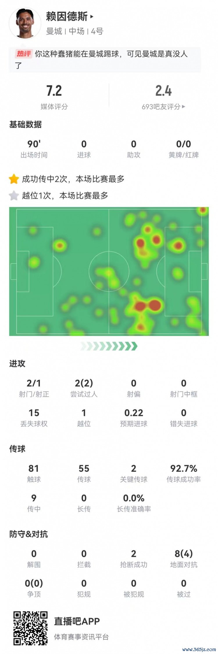 11月26日讯 曼城在本轮欧冠0-2不敌勒沃库森,赖因德斯本场数据如下: