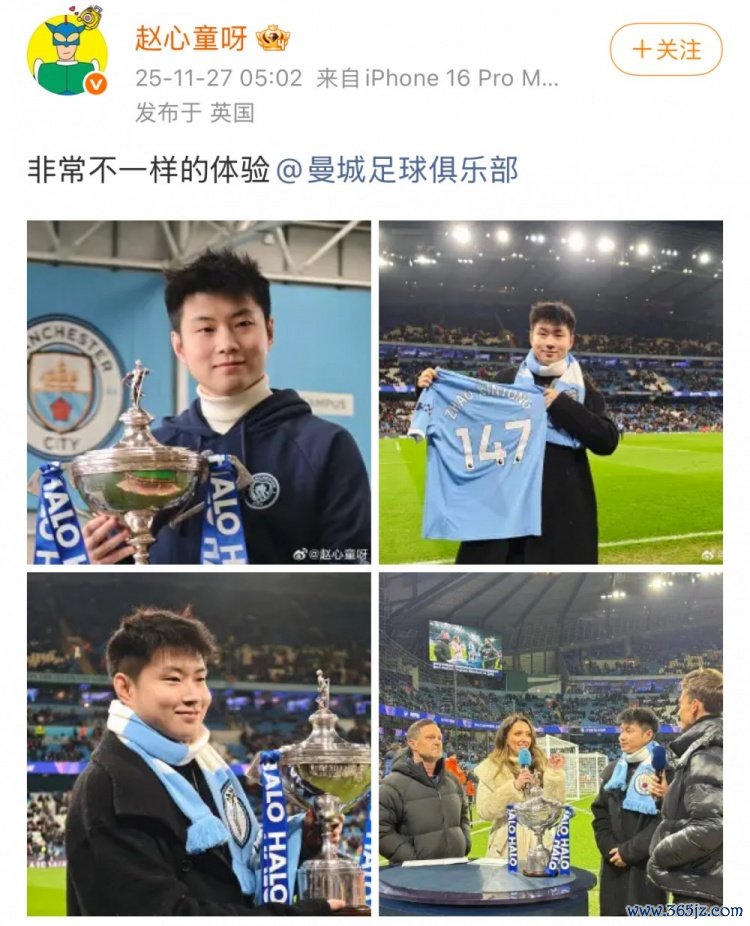 赵心童在社媒写说念:“绝顶不不异的体验。@曼城足球俱乐部”