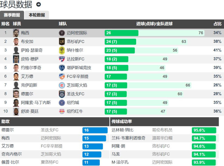 此役2射1传之后,梅西本赛季好意思职联进球数如故来到了26球,莫得点球,以2球的上风领跑好意思职联弓手榜,排行第二的是洛杉矶FC的博安加,打入了24球,但其中7球来自点球;梅西本赛季好意思职联助攻数如故来到了15次,以1次之差排行好意思职联助攻榜第二。