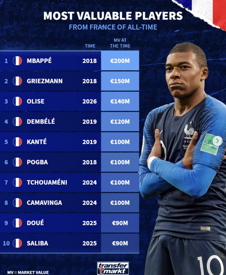 虎扑03月31日讯德转统计了法国球员历史身价最高榜。