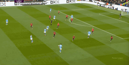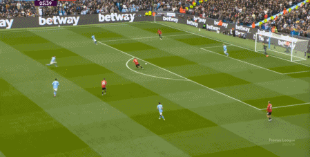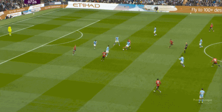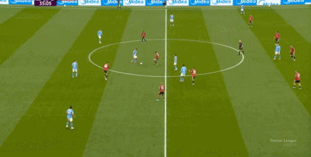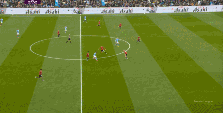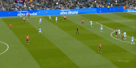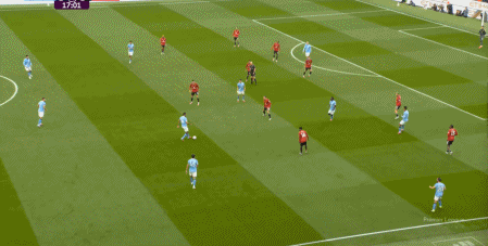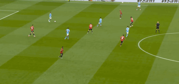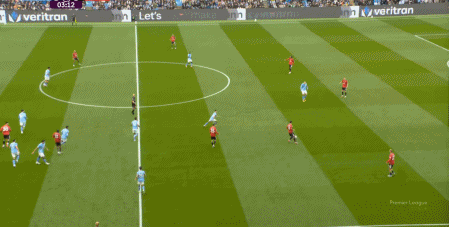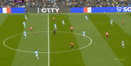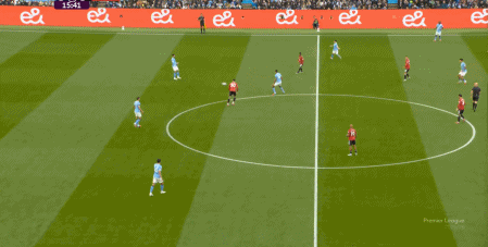 是布鲁诺扔下了福登,改为向前压迫罗德里,然后罗德里交给格瓦迪奥尔,拉出角度之后,就发现了直传福登的这条清醒,而乌加特还莫得到位: