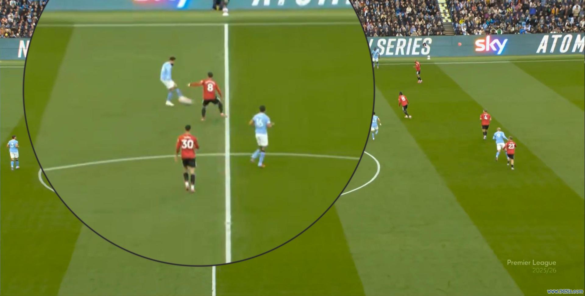 履行上,曼联从此次防护需要吸取的领导便是,不要认为敌手在压迫下就会草率出现空虚,因为格瓦迪奥尔出球刹那间,布鲁诺照旧近乎逼到极限了: