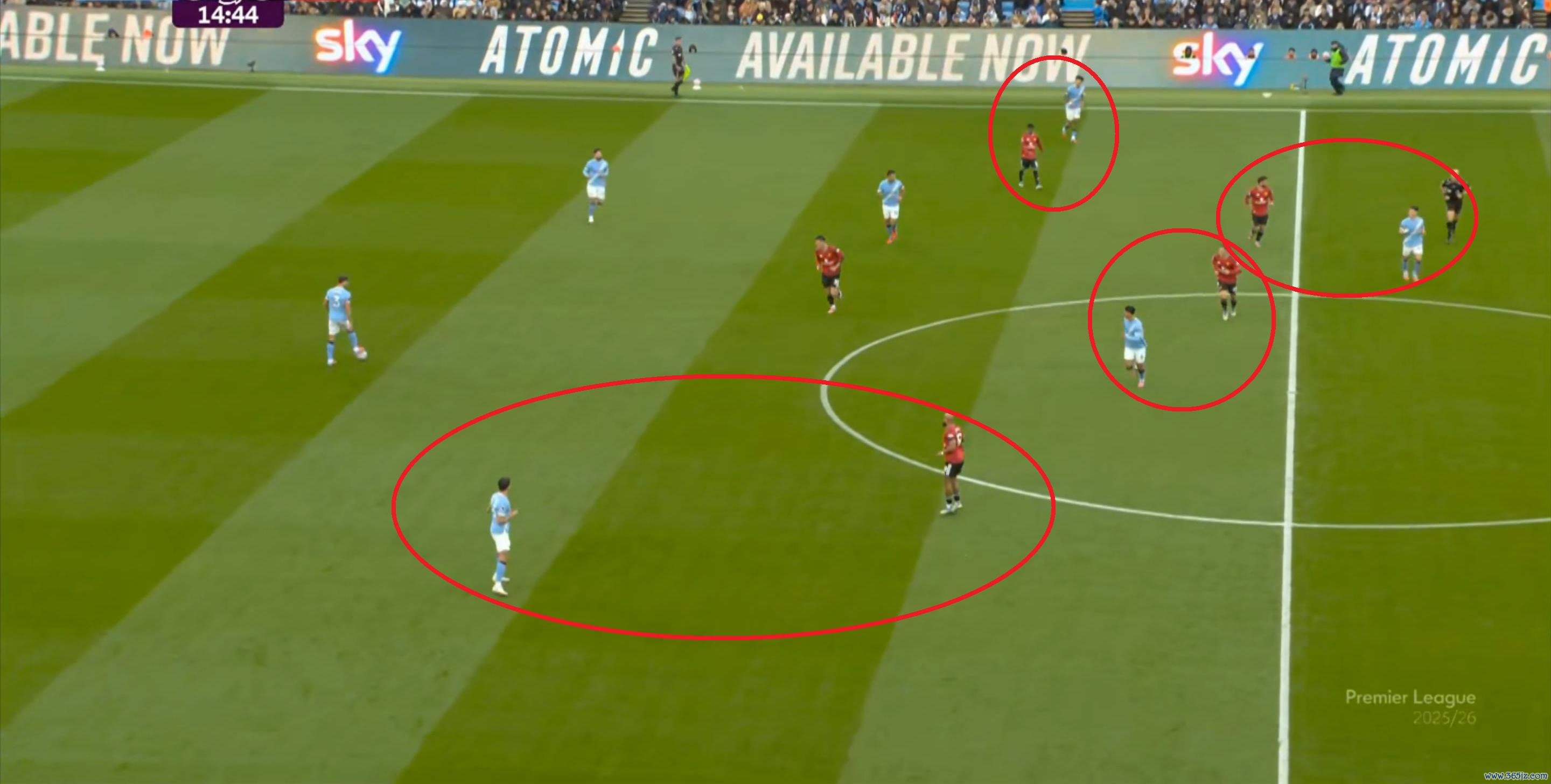 在此次中区防护的落位情况,曼联有着十分澄莹的东说念主盯东说念主想路,姆贝乌莫和阿玛德-迪亚洛盯防曼城的两个边后卫,布鲁诺盯福登,乌加特盯赖因德斯: