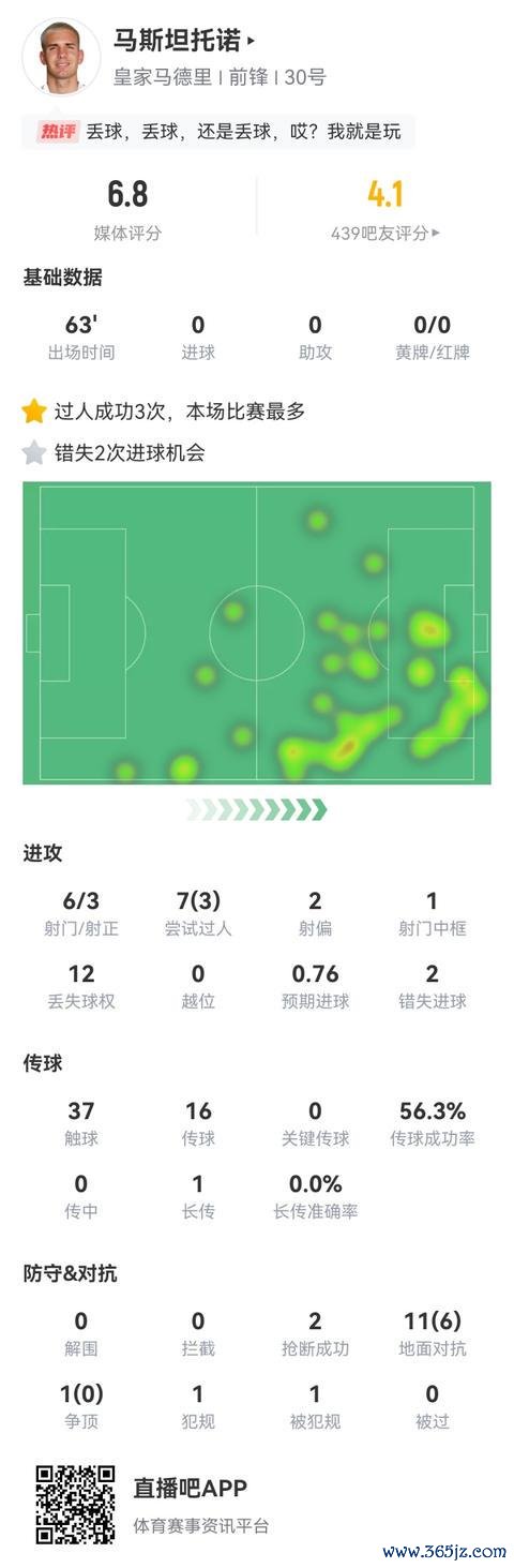 直播吧09月17日讯 凌晨新赛季欧冠首轮比赛,皇马主场2-1投诚马赛,本场比跑马斯坦托诺首发出战,在第63分钟被换下场,他在上半场补时阶段豪侈了一次绝佳契机。