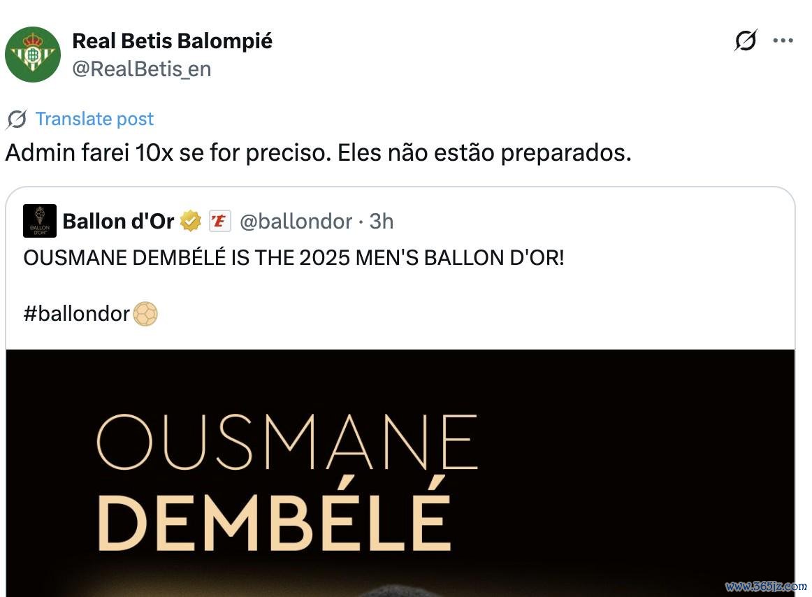 在本年的金球奖颁布后,皇家贝蒂斯在其官方应答媒体上转发了登贝莱获奖的官方帖子,并写说念:“细致东说念主,如若有必要我会付出10倍勤劳。他们还莫得准备好。”