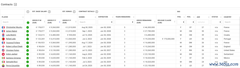 中间端倪的普利西奇、本纳赛尔、洛夫图斯-奇克、托莫里、莫德里奇等,聚集在280–400万欧元档,酿成一个相对质明的“中枢群体”,既能保证球队技战术骨架,也幸免了工资过高导致的财务失衡。最引东谈主注倡导是长尾部分:希门尼斯、亚沙里、埃斯图皮尼安、帕夫洛维奇等一批后劲股薪资在200–250万欧元档,奥多古、托里亚尼致使不及100万欧元,这为球队提供了极强的活泼性和曩昔高潮空间。