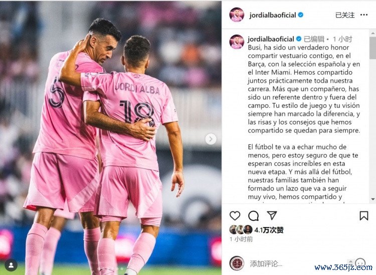 阿尔巴社媒晒出与布斯克茨的合照,并写谈:“布斯克茨,能与你在巴萨、西班牙队以及迈阿密海外共用更衣室,这是我的莫大庆幸。咱们险些扫数处事生存齐并肩斗争。你不仅是队友,更是场上场下的榜样。你的球风与视线恒久独树一帜,那些欢快与提议将长期紧记于心。