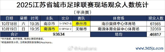 2025江苏省城市足球联赛现场不雅世东谈主数统计(半决赛)。泰州、南通区分点球打败敌手参预决赛。半决赛南京奥体中心现场不雅众61565东谈主,再调动高。