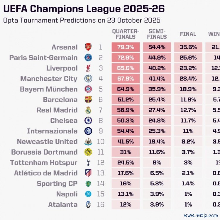 你的位置:J联赛直播 > 意甲联赛 > Opta欧冠最新夺冠概率:阿森纳21.13%最高,巴黎、利物浦二三位
