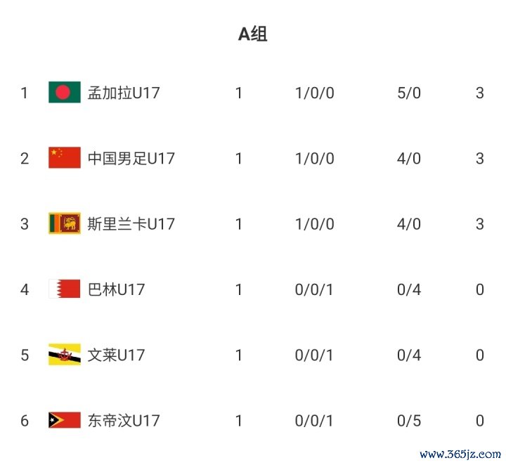 当今积分榜上,中国队以3分位列第2,以净胜球的舛错过时孟加拉U16。
