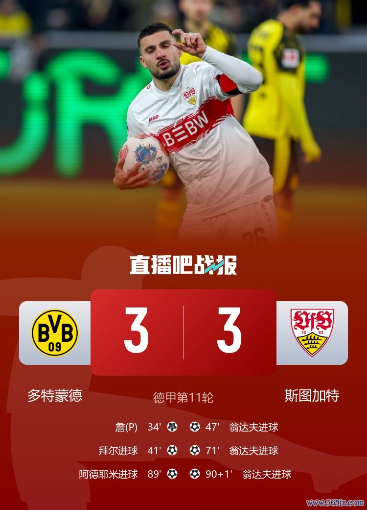 这名时尚此役献艺帽子戏法,包办斯图加特一齐进球,下半场补时阶段的进球匡助球队绝平多特,从客场带走1分。